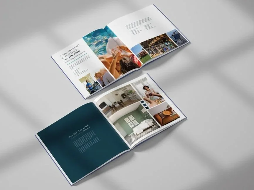 Telling the story of a local homebuilder, this coffee table book offers an elevated alternative to an easily disposable community brochure. This project necessitated engaging layout design and careful consideration of the interactions between spreads and pages. An alluring and information feature in this builder’s on-site Sales Center, this elegant 24-page 12x12" hardcover book was designed to showcase this homebuilder, their product at the Baltimore Peninsula, and the lifestyle of residents.